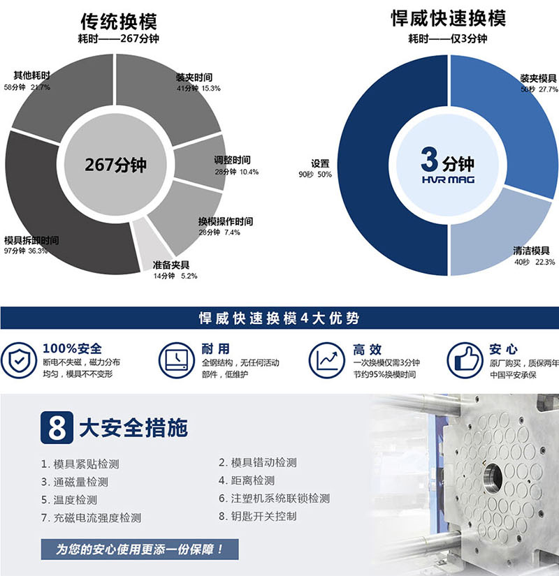 對比傳統的注塑生產線,使用磁力模板快速換模系統的優勢有: